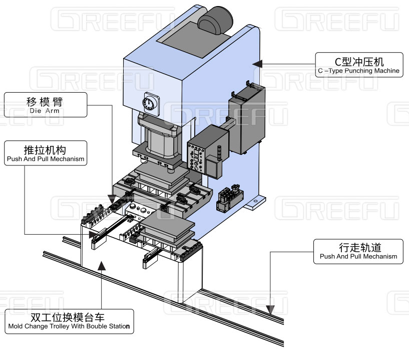 多臺沖床共用一套自動換模臺車系統(tǒng),該“自動換模臺車系統(tǒng)”能有效解決大型模具的換模作業(yè),如汽車鈑金、家電電梯等行業(yè)沖壓零件,且格萊富可依各種獨立作業(yè)需求研究開發(fā)各種搬運臺車,并可設(shè)計單鍵全自動或半自動對模具的搬入搬出,同時,現(xiàn)在該模具輸送系統(tǒng)也已逐漸被業(yè)內(nèi)接受與采用,尤其是,汽機車零組件等需大型模具的制造業(yè)等。