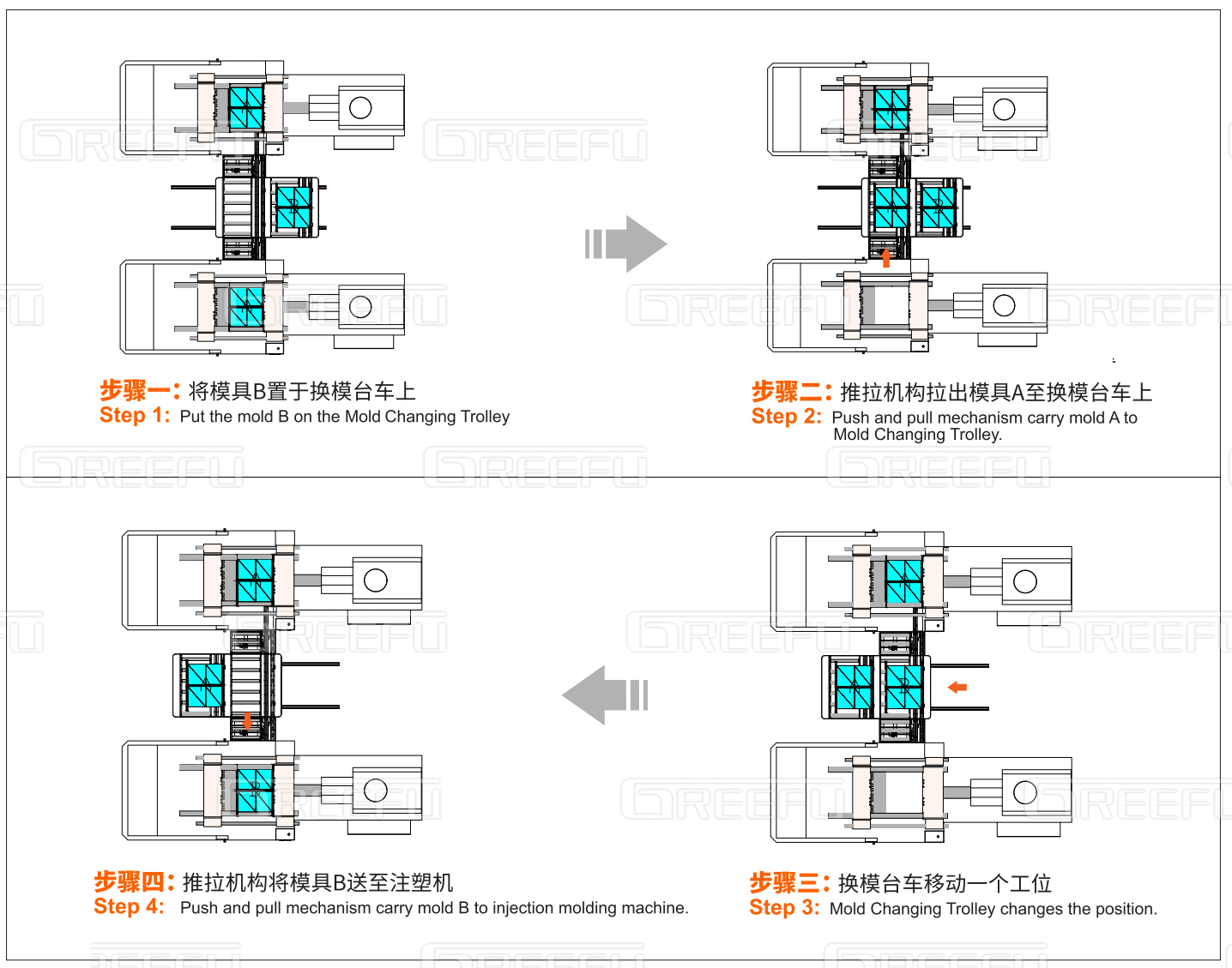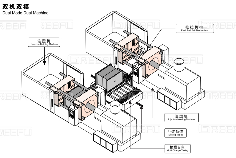 多臺(tái)注塑機(jī)共用一套自動(dòng)換模臺(tái)車系統(tǒng),該“自動(dòng)換模臺(tái)車系統(tǒng)”能有效解決大型模具的換模作業(yè),如汽車鈑金、家電電梯等行業(yè)沖壓零件,且格萊富可依各種獨(dú)立作業(yè)需求研究開(kāi)發(fā)各種搬運(yùn)臺(tái)車,并可設(shè)計(jì)單鍵全自動(dòng)或半自動(dòng)對(duì)模具的搬入搬出,同時(shí),現(xiàn)在該模具輸送系統(tǒng)也已逐漸被業(yè)內(nèi)接受與采用,尤其是,汽機(jī)車零組件等需大型模具的制造業(yè)等。